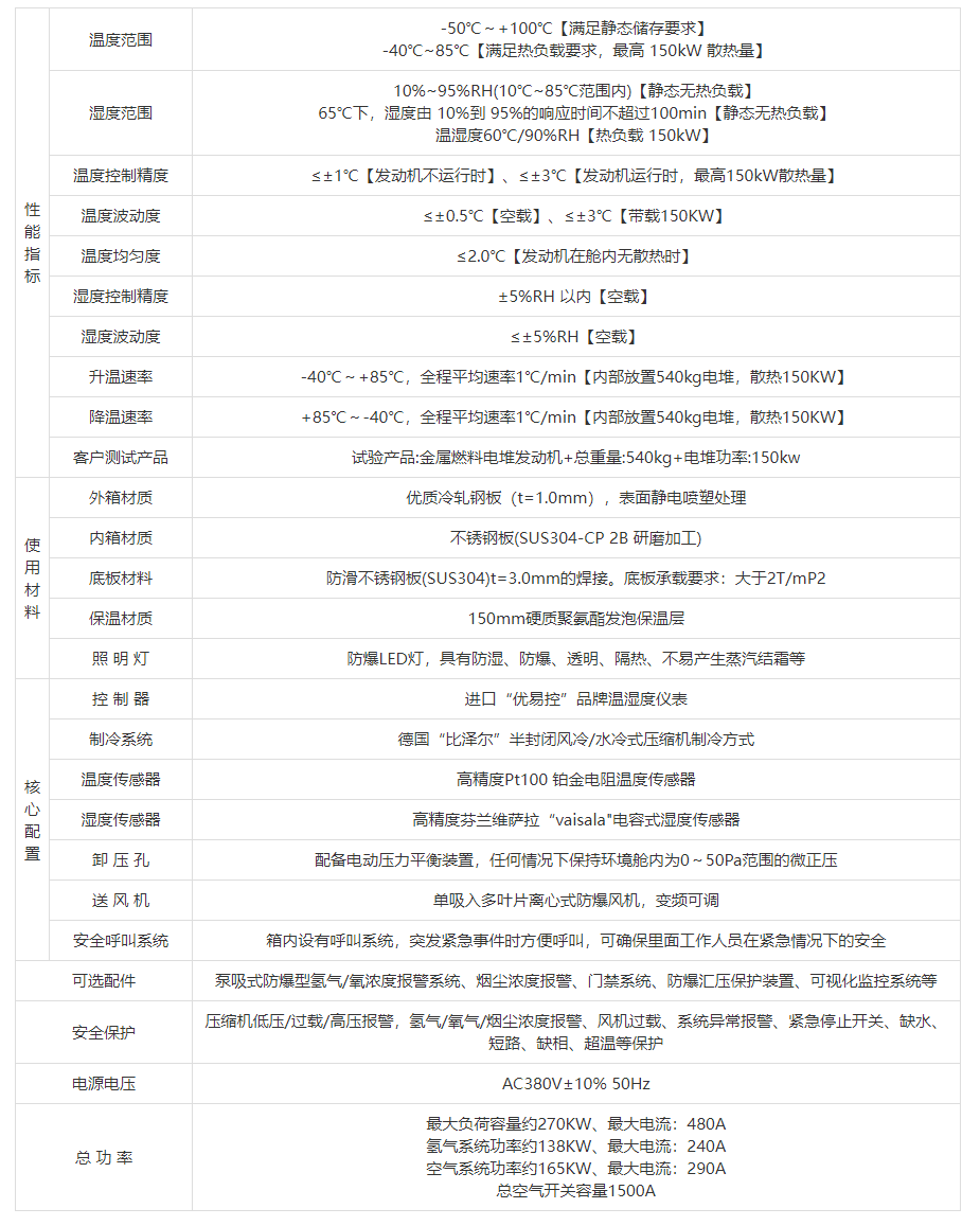 | 降溫速率 | +85℃~-40℃,全程平均速率1℃/min【內部放置540kg電堆,散熱150KW】 | |