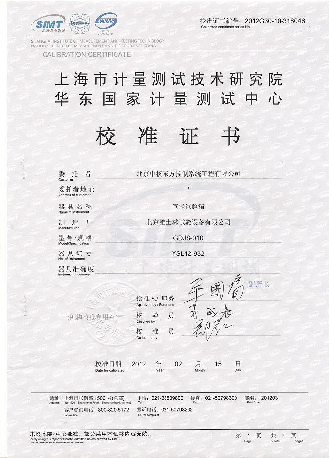 >>氣候試驗箱校準證書-上海計量院-中核控制2
