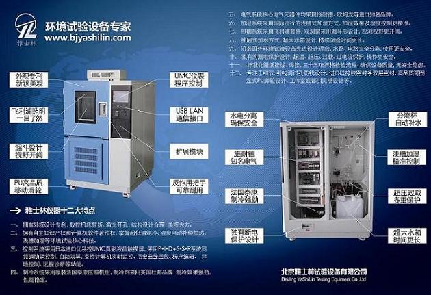 寶劍鋒從磨礪出,梅花香自苦寒來。雅士林儀器持續創新,開發最前沿的測試技術,使雅士林的產品肯有更加大的生命力。雅士林儀器定位于中高端客戶群,高品質、高性能高低溫交變濕熱試驗箱系列的產品特點: 1、擁有外觀設計專利,數控機床剪折、激光開孔,結構設計合理,新穎美觀。 2、擁有自主知識產權和計算機軟件著作權,掌握超低溫制冷、溫度自動補償加熱、淺槽加濕等環境試驗核心科技。 3、控制系統采用日本進口優易控UMC系列7英寸高清真彩液晶觸摸顯示屏,溫度控制采用P•I•D+S•S•R系統同頻道協調控制,自動演算的功能,支持電腦實時監控、歷史曲線回放、程序編輯、遠程診斷等功能。 4、制冷系統采用原裝法國泰康壓縮機組,制冷劑采用美國杜邦品牌,制冷效果強勁,性能穩定。 5、電氣系統核心電氣元器件均采用施耐德、歐姆龍等進口知名品牌。 6、加濕系統采用國際流行的淺槽式加濕方式,加濕效果及濕度控制更精準。 7、照明系統采用飛利浦套件,觀測窗采用漏斗形設計,觀測視野更開闊。 8、抽屜式加水方式,超大水箱設計,持續試驗時間更長。 9、沿襲國外環境試驗設備先進設計理念,水路、電路完全分離,使用更安全。 10、獨有的漏電保護設計,超溫、超壓、過載、過電流保護,操作更安全。 11、標準化圖紙接線、焊接,三十五項嚴格檢驗流程,確保設備質量,無安全隱患。 12、專注于細節,引線測試孔防銹設計、進口硅橡膠密封條雙層密封、高品質可固定式PU腳輪設計、工作室底部引流槽設計等。 全國免費服務電話:4006 400 998 |