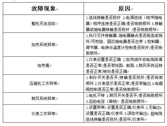 很多人可能會對高低溫試驗箱偶爾出現的異常狀況弄的一頭霧水,下面就有請專業技術工程師為我們講解高低溫試驗箱出現異常狀況時我們應該怎么處理,下面的一張表讓你明明白白,大家可簡單的對號入座。