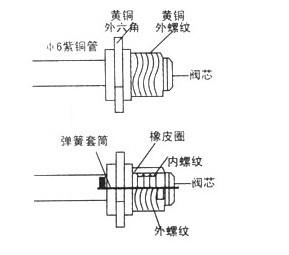 購單向閥一支,結構見下圖。取下單向閥的閥芯,把單向閥焊在高低溫試驗箱的工藝管上。確認焊接牢固、無漏,再裝上閥芯。抽真空時用帶有頂針的加氟管連結,另一頭與角閥連接。然后再接表和真空泵。抽真空后,卸下真空泵,換上加氟鋼瓶,排除角閥后(第二根加氟管)加氟管中的空氣,再加氟。
