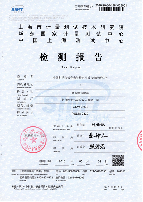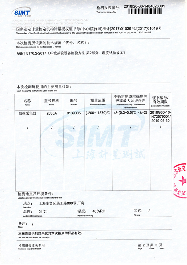 高低溫試驗箱在首次投入使用前,應對可反映設備性能的相關參數(shù)進行詳細確認及測試,在日常使用中則應依據(jù)所使用的試驗方法進行對試驗參數(shù)的要求,需確認其性能是否滿足試驗參數(shù)的要求。更多的用戶會選擇由第三方檢測機構進行檢測,并出廠檢測報告,如下: